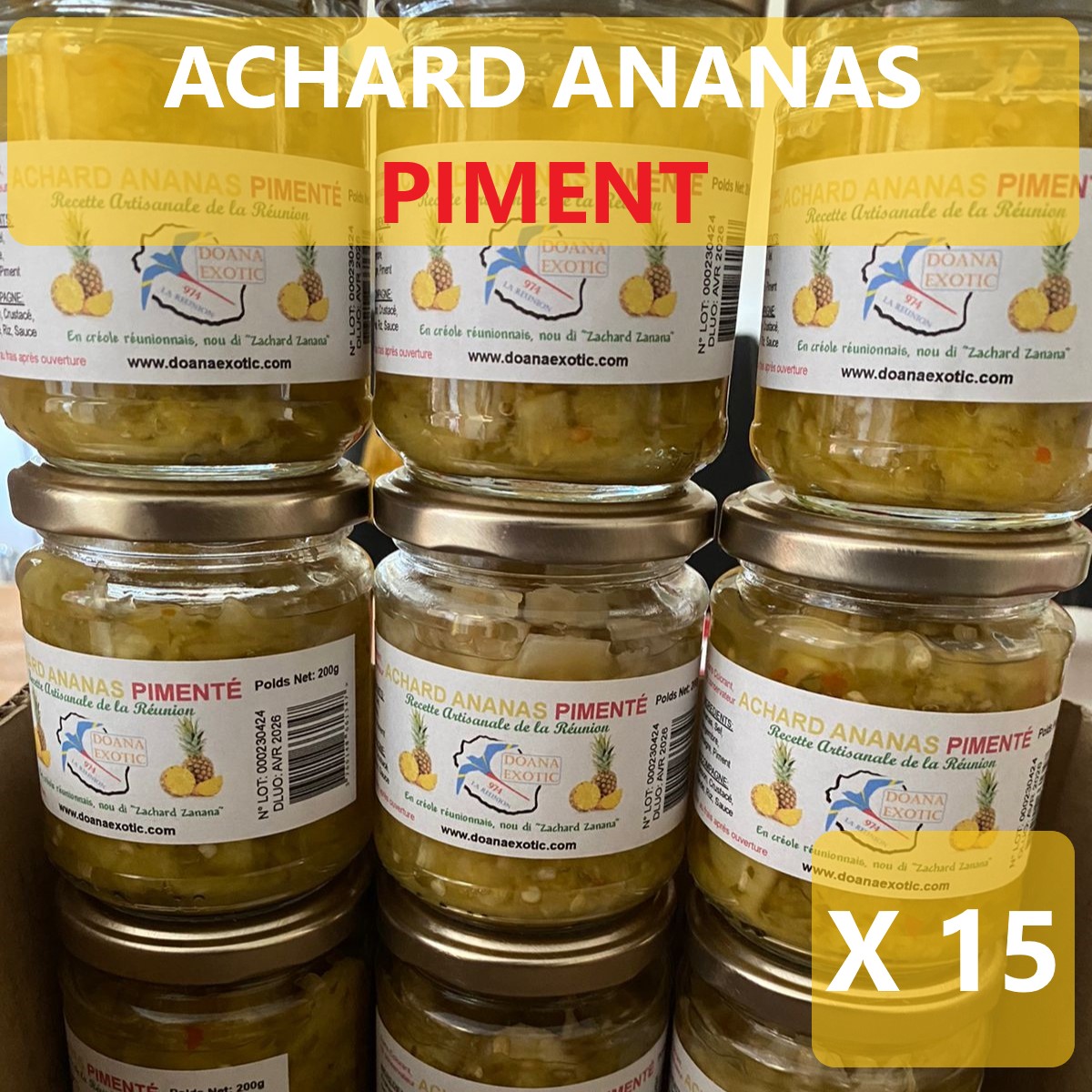 Colis contenant 15 bocaux d’Achard ananas pimenté 200g.